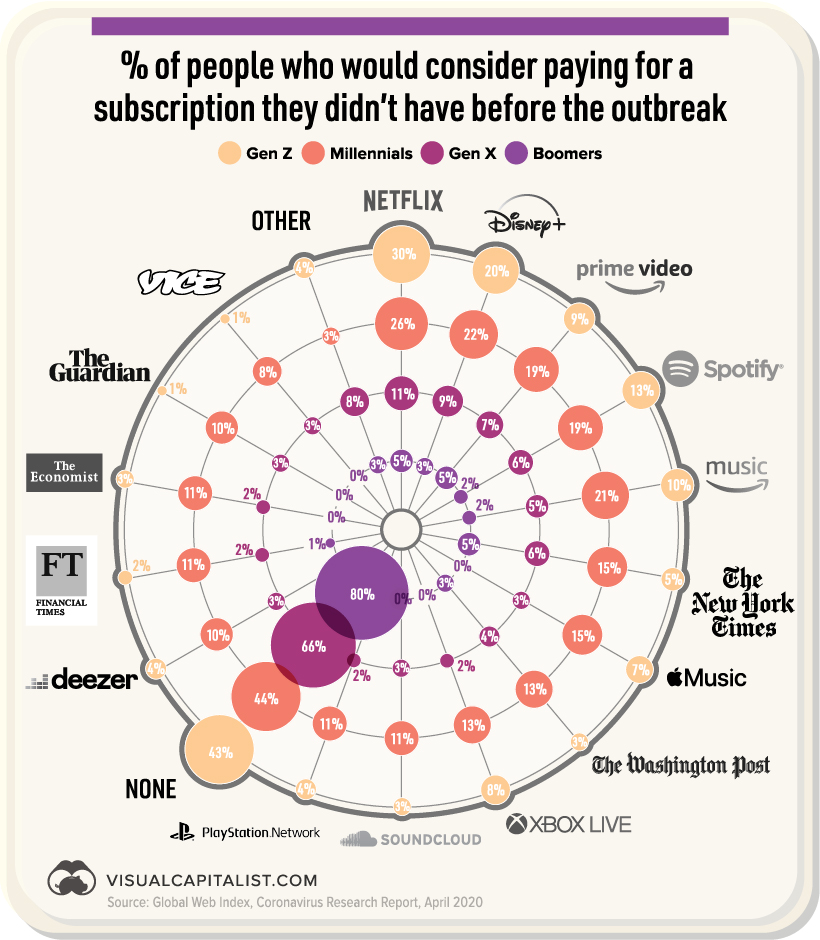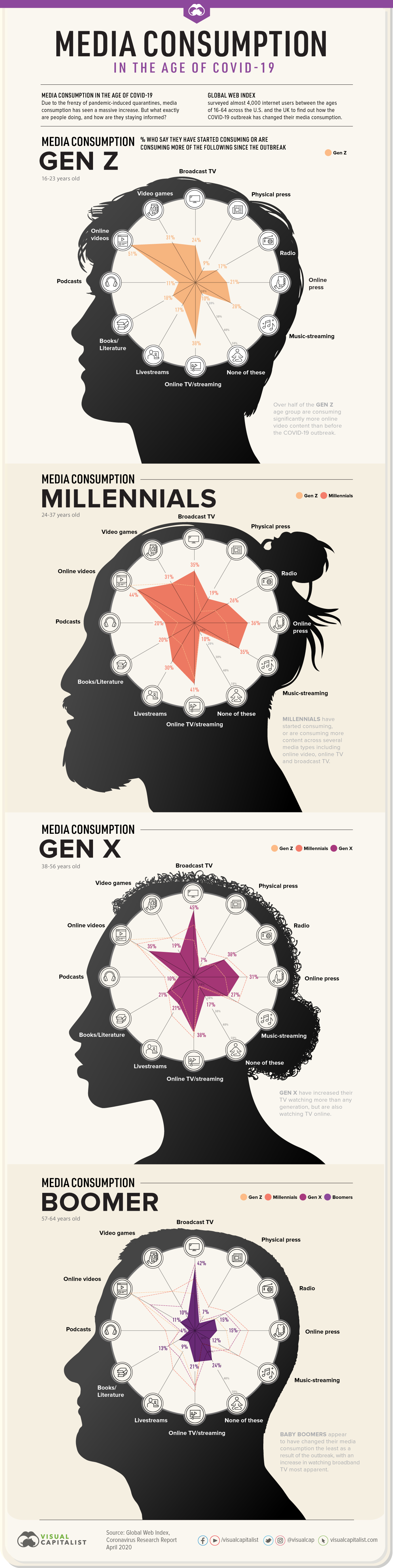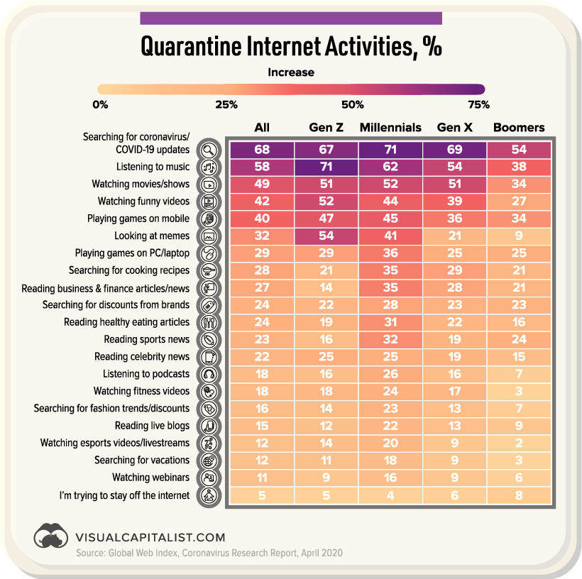 También descubrimos que la generación que se podría considerar más despreocupada resulta ser la Generación Z, con un porcentaje del 71%, la cual estaría escuchando música como actividad en la cuarentena. Estos porcentajes y reveladores datos los podemos observar gracias a los infográficos publicados por Katie Jones de Visual Capitalist: